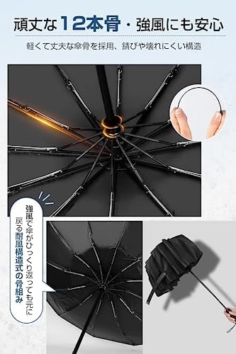 しなやかで高強度な12本親骨で作られ、耐風性と耐久性ともに向上させ、強風にあおられても豪雨に打たれても簡単に折れない折り畳み傘です。