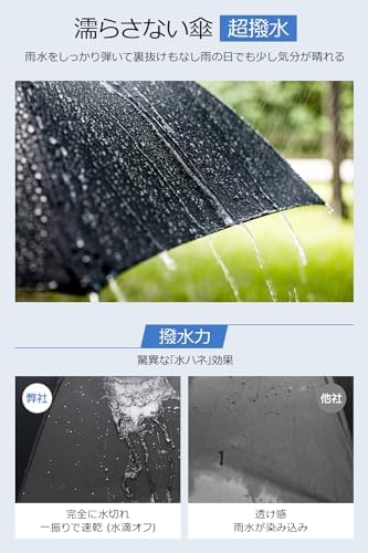 高密度生地で防水性の高いテフロン加工を施され、撥水性に優れて、大雨の中でも雨水が吸収されにくいので、体が濡れることはありません。傘を閉じた後、軽く振るだけで水滴を落とせます。